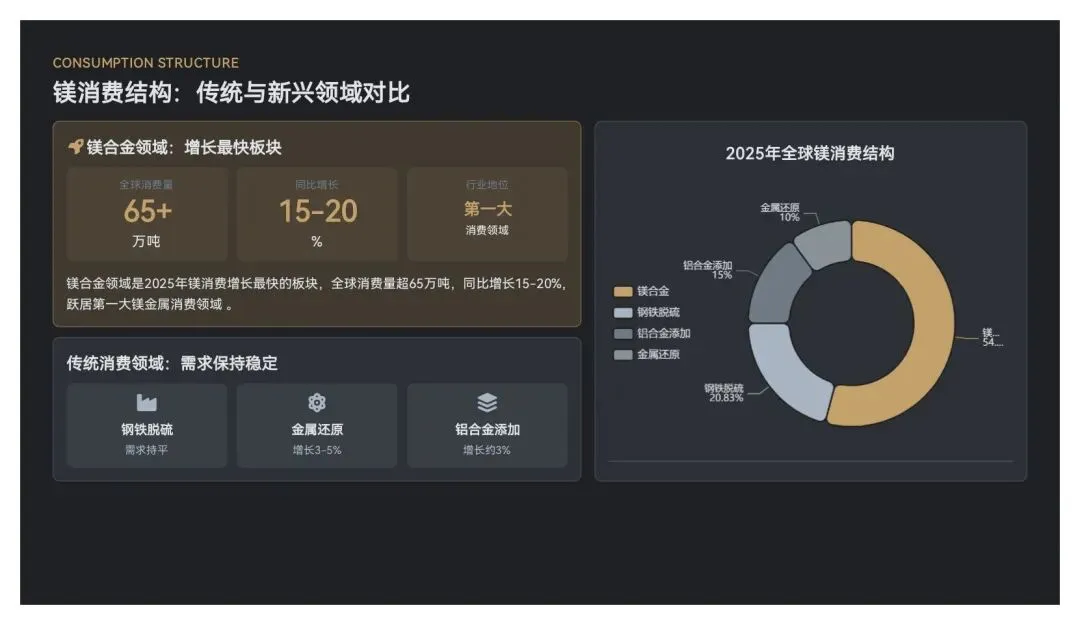 镁合金领域是2025年镁消费增长最快的板块,全球消费量超65万吨,同比增长15-20%,居第一大镁金属消费领域,形成“熔铸—加工—废料回收”协同发展格局,七大应用领域全面突破。