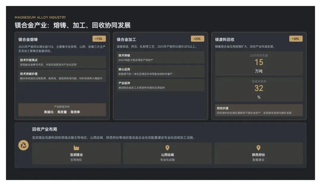 镁废料回收:随着镁合金应用规模扩大,回收产业快速发展,2025年国内镁废料回收量约15万吨,同比增长30%,回收利用率达32%。宝武镁业在废料回收领域占据主导地位,山西运城、陕西府谷等地区镁合金企业也在配套建设专业化回收加工设施,回收废料经处理后重新用于镁合金生产,实现降本减排与循环发展。