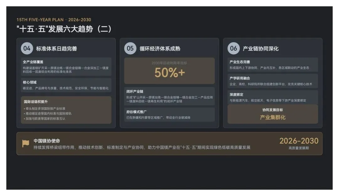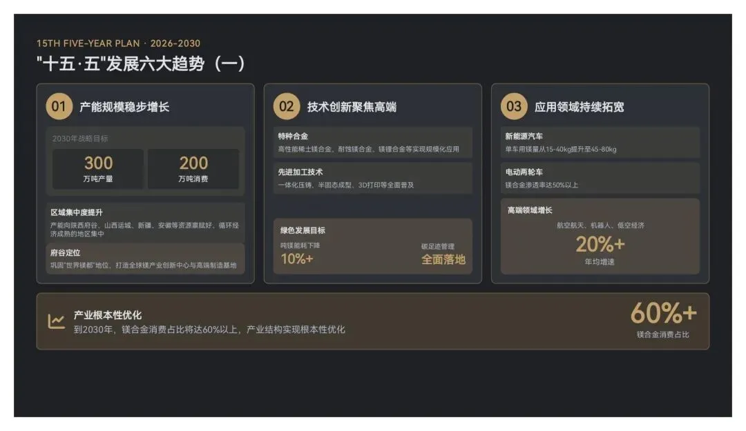 “十五·五”(2026-2030年)是我国镁产业实现“从规模扩张向质量效益转型、从低端制造向高端引领跨越”的关键时期,在政策支持、技术创新、市场需求的多重驱动下,产业将呈现六大发展趋势: