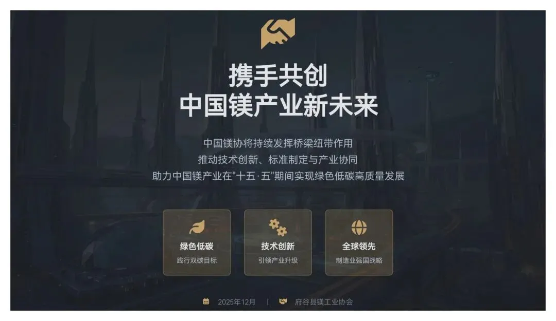 中国镁协仍将持续发挥桥梁纽带作用,推动技术创新、标准制定与产业协同,助力中国镁产业在“十五·五”期间实现绿色低碳高质量发展,为国家“双碳”目标与制造业强国战略贡献镁产业力量。