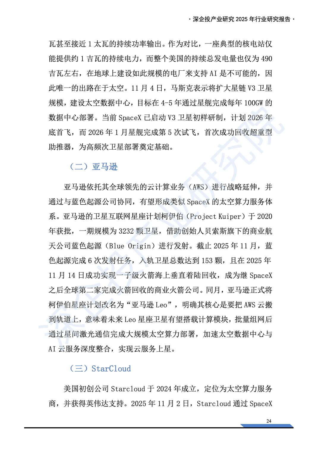 美国是科技巨头主导的商业化路径。SpaceX计划通过星舰部署太空数据中心,目标4-5年内实现每年100GW部署。亚马逊要把AWS云搬到轨道上,Starcloud公司已经发射了搭载H100芯片的试验卫星。