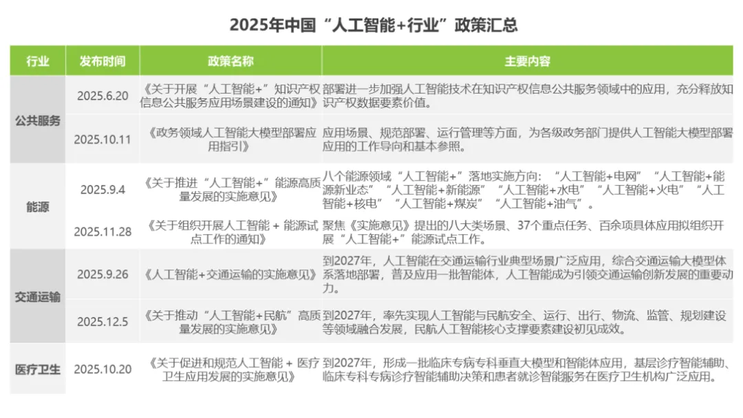 报告的另一个重要洞察,是来自国家层面的强劲政策驱动。2025年,我国围绕 “人工智能+” 行动密集出台系列政策,在能源、交通、医疗、教育等重点领域全面推动AI融合与应用落地。