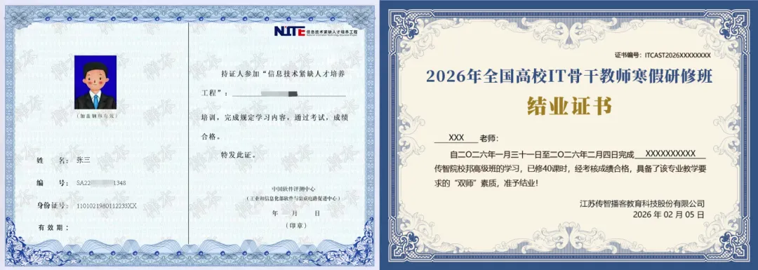 5.资源加持,长效支持:参训教师可免费获取传智教育教辅平台的海量教学资源,并可以获得由主办方颁发的“NITE专业技能培训证书”及承办方颁发的“双师型培训结业证书”双证书认证,为个人职业发展增添有力凭证。