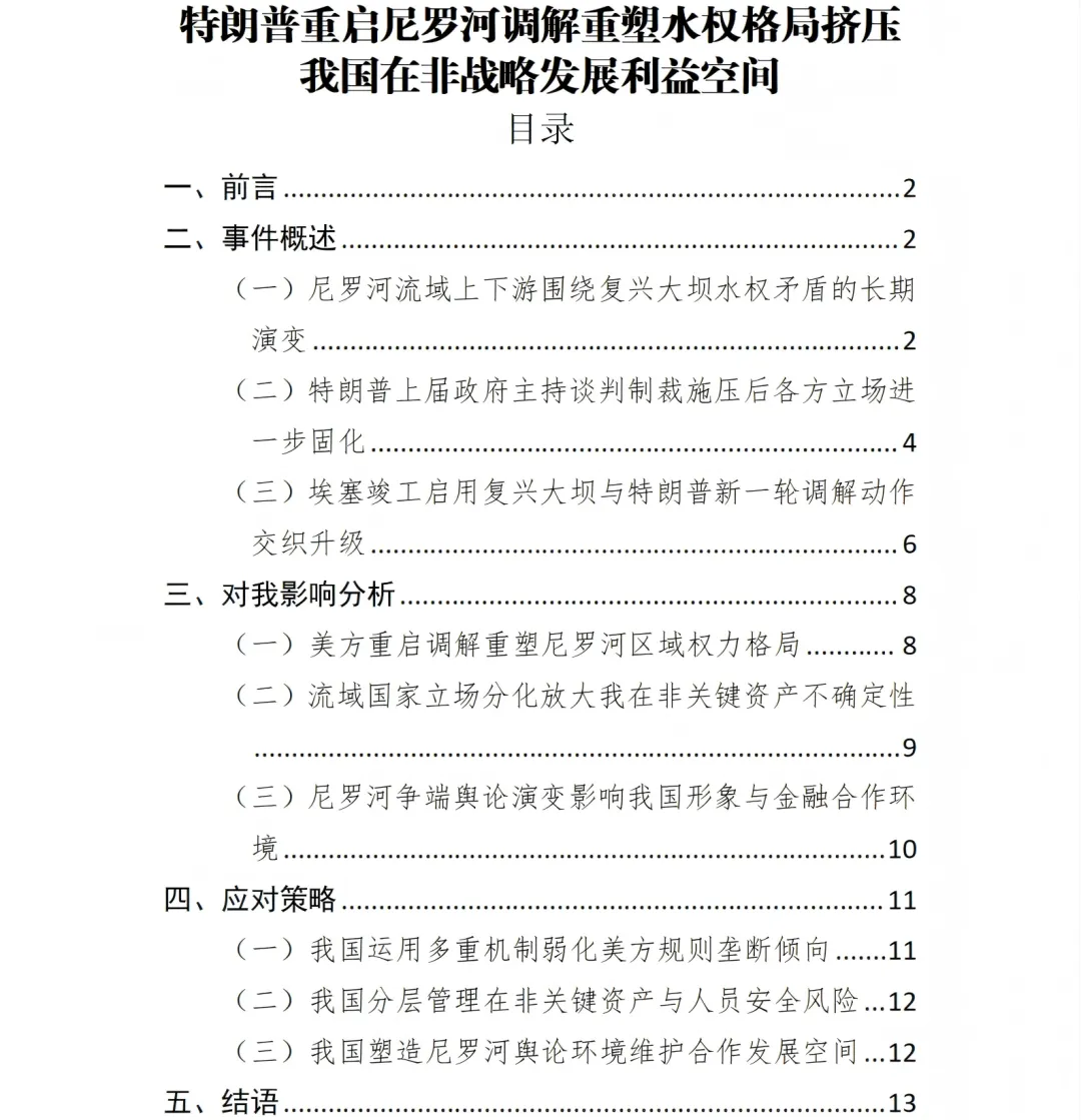尼罗河水权博弈既关乎埃及、苏丹生存安全和复兴大坝电力外溢,也直接牵动红海—地中海通道稳定及区域政治走向,其外溢效应已跨越非洲东北部并叠加中东动荡。在美方重新上手、流域各方立场加速分化背景下,我国在埃及、埃塞俄比亚、苏丹及红海沿岸的基础设施、电力、港口等合作面临风险集聚,迫切需要从国家总体安全和对外布局层面开展针对性研判与政策储备。