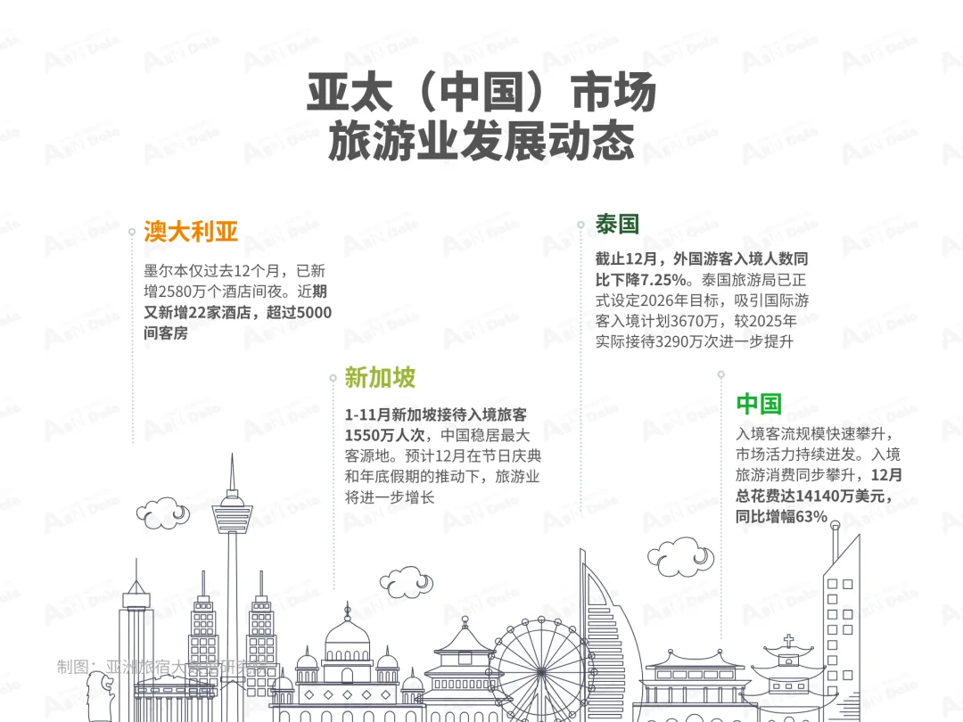 澳大利亚方面, 根据亚洲旅宿大数据研究院监测,12月,澳大利亚旅游成绩斐然。以墨尔本为例,墨尔本拥有918座公园,包括每年近吸引百万游客的皇家植物园和菲茨罗伊花园等知名景点,市内更栖息着超过4300种植物和450种鸟类。如此丰富的生态环境,使墨尔本成为宜居、宜工作、旅游的城市。墨尔本还拥有澳大利亚最发达的电车网络,并刚刚实现了五座充满艺术气息的城市建设在住宿方面,近现有酒店客房总数达27000间,居全国之首,近期又新增22家酒店、超过5000间客房,头部背包客栈、精品酒店与豪华品牌,为游客提供了更加多元的选择。未来即将有上千间酒店客房陆续投入市场。仅过去12个月,已新增2580万个酒店间夜。墨尔本会议局12月发布了全新独特的《墨尔本活动策划者指南》,聚焦本地体验的体验项目,包括俯视大洋路、热气球饱览都市全景、菲利浦岛与莫宁顿半岛的温泉体验,以及南半球最大购物中心等。
