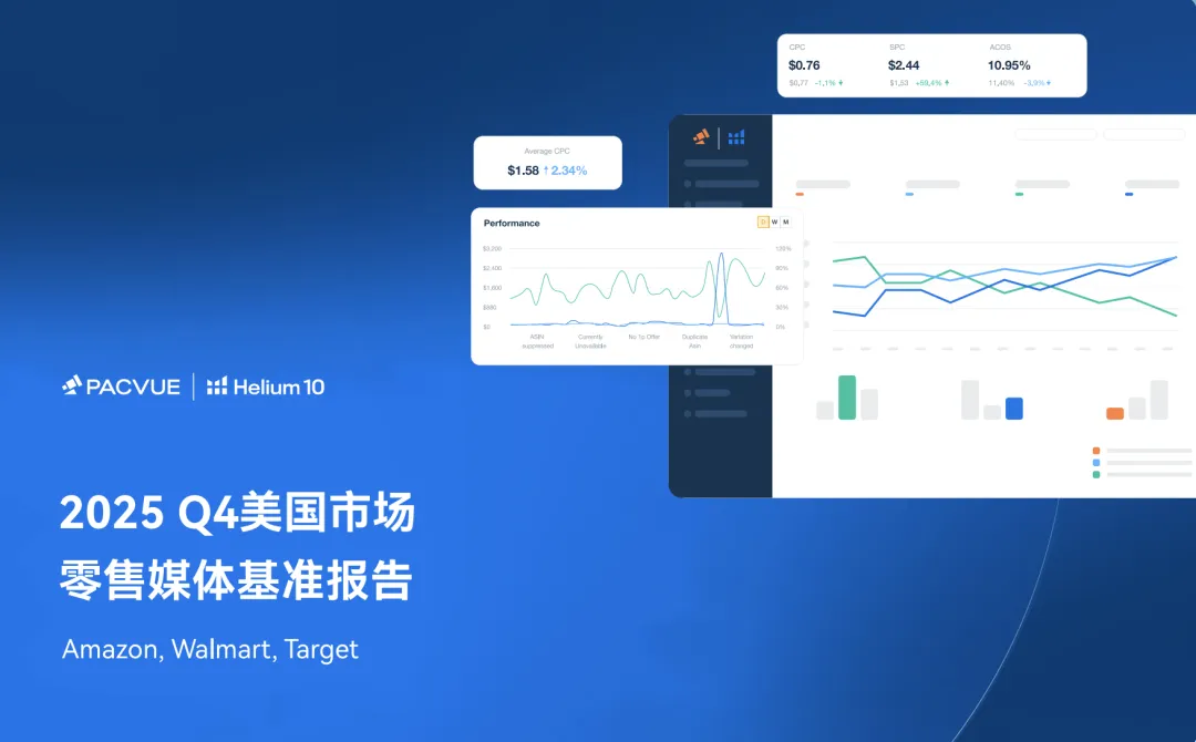 Pacvue 联合 Helium 10 发布《2025 Q4 美国市场零售媒体基准报告》,基于 Amazon、Walmart、Target 在 Q4期间的广告数据,系统梳理了 CPC 变化、投放结构与消费者行为趋势。