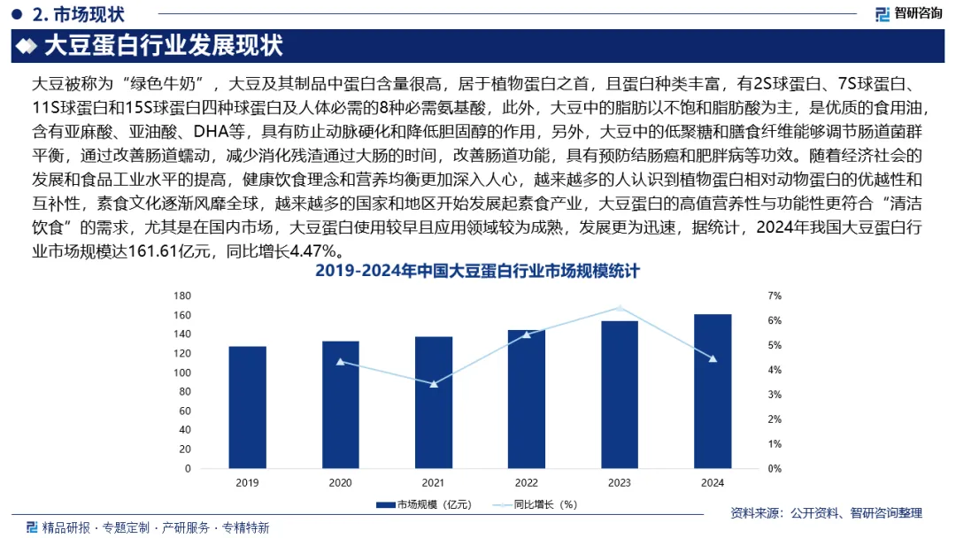 市场规模:随着经济社会的发展和食品工业水平的提高,健康饮食理念和营养均衡更加深入人心,越来越多的人认识到植物蛋白相对动物蛋白的优越性和互补性,素食文化逐渐风靡全球,越来越多的国家和地区开始发展起素食产业,大豆蛋白的高值营养性与功能性更符合“清洁饮食”的需求,尤其是在国内市场,大豆蛋白使用较早且应用领域较为成熟,发展更为迅速,据统计,2024年我国大豆蛋白行业市场规模达161.61亿元,同比增长4.47%。
