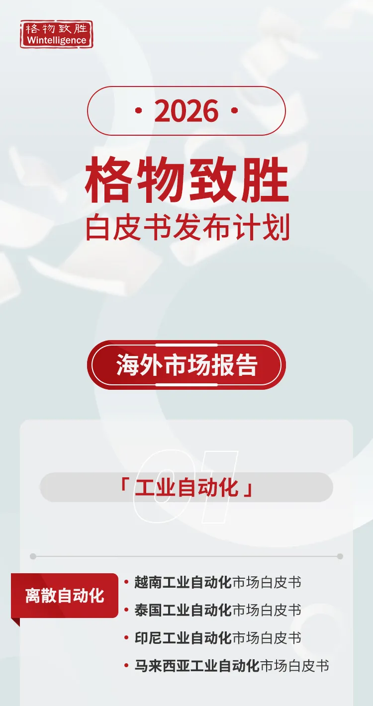 格物致胜2026年白皮书发布计划重磅预告!依托长期服务头部企业的深厚积淀,结合每年对数百位行业专家的定向访谈,格物致胜将沉淀的行业洞察凝练转化为多领域白皮书。2026年格物致胜拟发布白皮书超百份,不仅覆盖工业自动化、输配电等传统优势领域,更拓展至数据中心、芯片等前沿赛道;研究区域亦着眼于海内外,在深化东南亚、中东市场研究的同时,延伸探索欧美市场。本系列白皮书将从市场规模预测、竞争格局剖析、技术趋势研判等核心维度,全方位捕捉海内外行业动态,助力读者解锁前沿产业视野。