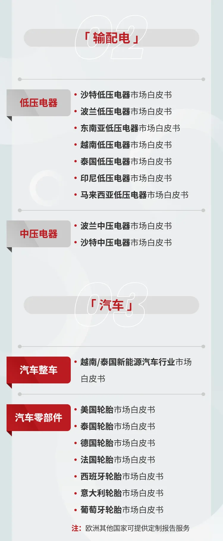 全面深化东南亚市场研究工作,能够提供区域内各国自动化与配电板块的完整研究内容,覆盖东南亚全境及越南、泰国、印度尼西亚、马来西亚四国的详尽数据,且延伸开展汽车、轨道交通等领域的研究;针对中东沙特、欧洲波兰等热点国家,聚焦输配电领域开展探索性研究,同时启动美国市场探索性研究,发布对应的轮胎市场专业报告。