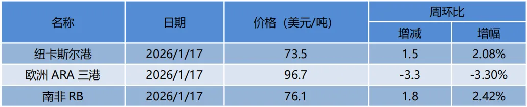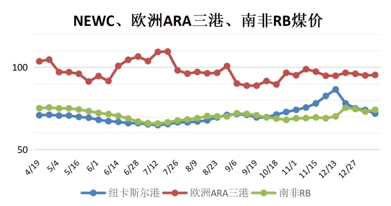 国际煤价呈现涨跌分化态势。截至1月17日,纽卡斯尔NEWC5500大卡动力煤FOB现货价报73.5美元/吨,较上周环比上涨1.5美元/吨;ARA6000大卡动力煤现货价为96.7美元/吨,周环比下跌3.3美元/吨;理查兹港动力煤FOB现货价达76.1美元/吨,周环比上涨1.8美元/吨。