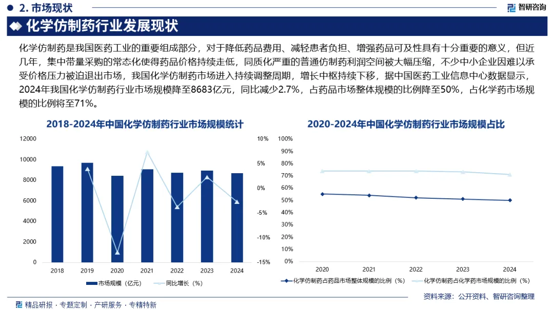 化学仿制药,即通用名药(genericdrug),也称非专利药、学名药,是指原研药物(也称专利药、品牌药)专利到期或得到专利授权后,其他制药企业参照相关标准开发生产的,具有相同活性成分、剂型、给药途径和治疗作用,在临床治疗上被认为与原研药物可以等效替代的药物。仿制药是我国医药工业的重要组成部分,对于降低药品费用、减轻患者负担、增强药品可及性具有十分重要的意义,但近几年,集中带量采购的常态化使得药品价格持续走低,同质化严重的普通仿制药利润空间被大幅压缩,不少中小企业因难以承受价格压力被迫退出市场,我国化学仿制药市场进入持续调整周期,增长中枢持续下移,据中国医药工业信息中心数据显示,2024年我国化学仿制药行业市场规模降至8683亿元,同比减少2.7%,占药品市场整体规模的比例降至50%,占化学药市场规模的比例将至71%。
