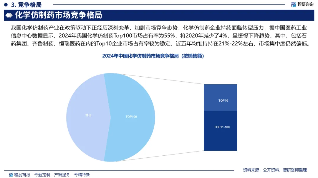 市场竞争格局:我国化学仿制药产业在政策驱动下正经历深刻变革,加剧市场竞争态势,化学仿制药企业持续面临转型压力,据中国医药工业信息中心数据显示,2024年我国化学仿制药Top100市场占有率为55%,将2020年减少了4%,呈缓慢下降趋势,其中,包括石药集团、齐鲁制药、恒瑞医药在内的Top10企业市场占有率较为稳定,近五年均维持持在21%-22%左右,市场集中度仍然偏低。