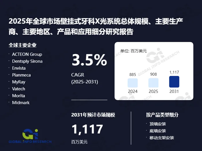 据环洋市场咨询(Global Info Research)调研团队最新报告“2025年全球市场壁挂式牙科X光系统总体规模、主要生产商、主要地区、产品和应用细分研究报告”显示,按收入计,2024年全球壁挂式牙科X光系统收入大约885百万美元,预计2031年达到1117百万美元,2025至2031期间,年复合增长率CAGR为3.5%。