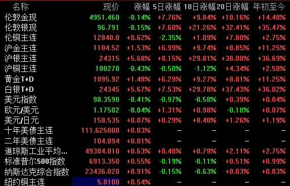 现货黄金价格强劲上涨1.76%,收盘报每盎司4921.51美元,历史上首次突破4900美元关口。现货白银价格同步大涨3.31%,收于每盎司96.15美元,也刷新纪录高位。