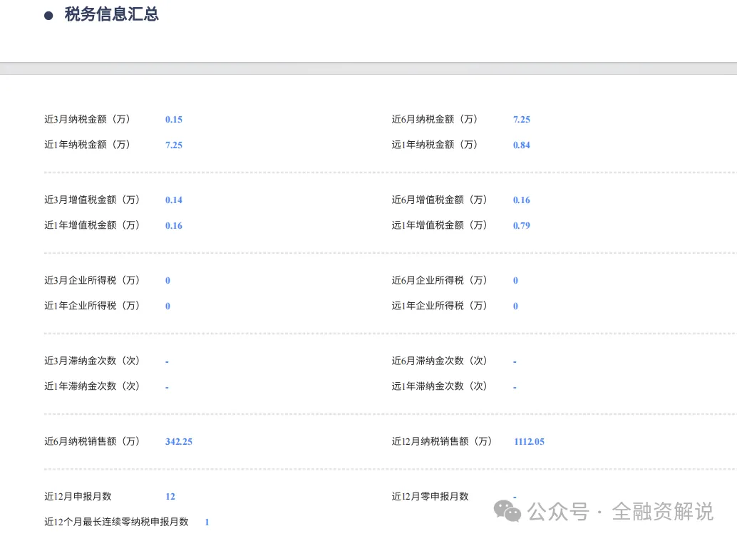 ⑴税务合规性与纳税质量:税务等级,纳税时长、金额、连续性、0申报月份占比、欠税记录及较上一年度同比环比增长情况