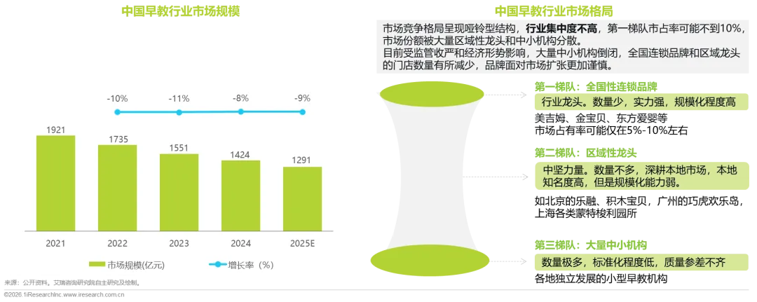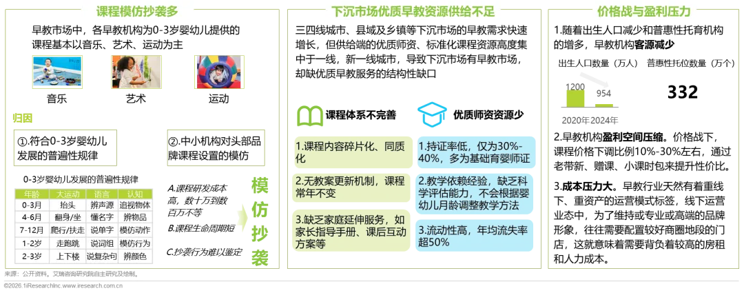 早教市场面临结构性困境。课程同质化源于婴幼儿发展规律与研发成本压力;下沉市场存在有市场无质量的供需错配。核心瓶颈在于优质师资稀缺和课程资源向上线城市流动。同时,人口下滑与普惠托育扩张正使得早教机构客源减少,为吸引客源机构间进行价格战,进一步挤压本就沉重的线下运营利润,行业亟待突破重资产、轻创新的恶性循环。