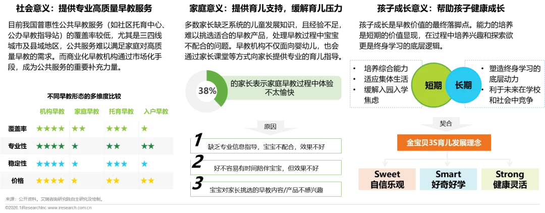 早教行业的社会价值在于有效弥补了普惠性公共服务的结构性缺失,尤其在低线城市;其家庭价值核心在于为缺乏系统育儿知识的双职工家庭提供了教养支持,降低了育儿焦虑;而对儿童成长的终极价值,则超越了短期能力培养,在于构建早期社交环境、适应集体规则,并激发终身学习的内在动力,这与金宝贝的3S育儿发展理念十分契合。