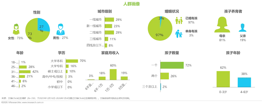 高线城市高学历已婚女性为主,孩子多为0-3岁,处于早教核心阶段。
