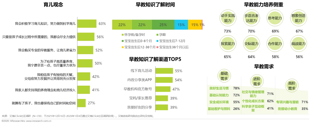 从育儿端看,超50%家长践行科学育儿并愿为孩子成长全力投入;早教认知前置至怀孕前和孕期,线下育儿活动和内容类APP成核心信息渠道,体现数字化渗透下的早教决策前置化和早教重线下的影响力;