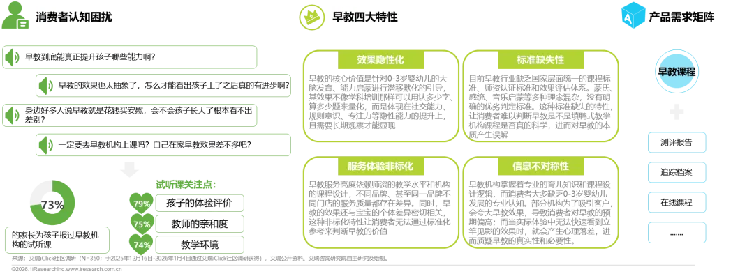 早教提供的本质上是能力发展的长期期权,而消费者期待的是短期可见的刚需服务。由于效果隐性、标准缺失、服务非标及信息不对称,家长难以量化其价值。因此早教机构在售卖早教课程外,又提供测评报告、追踪档案等服务,通过长期数据积累来实现早教效果的量化,实现孩子成长的可视化,弥补早教机构与家长认知之间的鸿沟,同时可以也通过提供试听课来初步排除消费者的认知困扰。