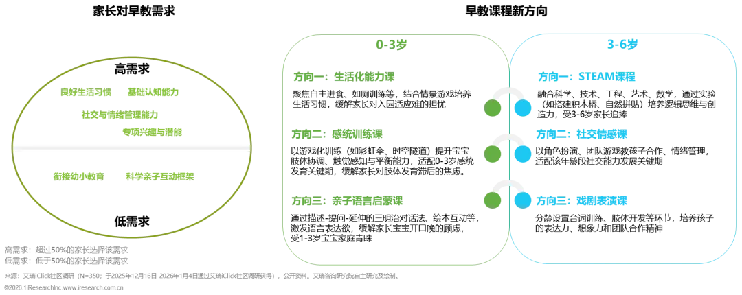 能力培养侧,动手实践、语言表达、思维等能力为家长能力培养核心诉求;延伸至早教需求,则体现为侧重生活习惯、认知能力、社交能力等中低阶需求。