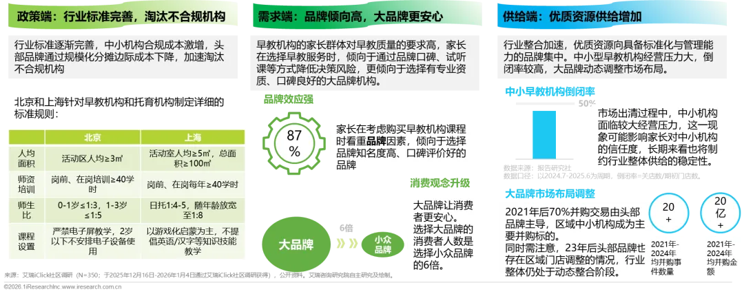 政策端,北上等核心城市率先出台的严格标准(面积、师资、师生比)大幅提升了合规成本,头部品牌凭借规模效应更能适应,而中小机构压力巨大;需求端,家长高度依赖品牌背书,消费观念升级加速了信任向头部品牌集中;供给端,行业处于动态整合阶段,中小机构倒闭多、头部品牌闭店时有发生,但整体来看优质资源向具备标准化与管理能力的品牌集中。