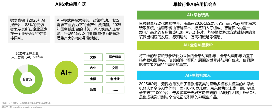 AI技术在各行业的应用越来越广泛和深入,AI技术有机会推动早教行业向数据智能驱动演进。AI技术能够应用在早教玩具、品牌形象打造和早教机器人上,增强孩子的互动感和陪伴感,有利于建立更深的情感联结。这预示着行业竞争将增加技术融合能力这一新维度,但如何平衡数据应用与隐私保护,将成为下一阶段的关键挑战。