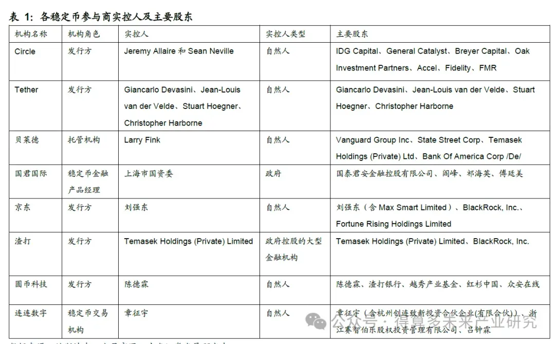 稳定币市场的主要参与者呈现出多元化特征,涵盖发行方、托管机构、交易机构、金融产品经理等不同角色。发行方包括Circle(USDC)、Tether(USDT)等美元稳定币发行商,以及京东、渣打银行和圆币科技等港币稳定币发行机构。这些机构大多与传统金融体系深度绑定,如Circle 的股东包含富达等传统资管巨头,实控人多为自然人。贝莱德作为托管机构参与其中,国君国际则扮演稳定币金融产品经理的角色,实控人为政府机构。值得注意的是,市场呈现明显的区域分化,美元稳定币由美国机构主导,港币稳定币则由中港机构发行,反映了稳定币市场在创新中仍延续传统货币体系的格局。这一参与者结构表明,稳定币并非完全脱离传统金融,而是通过新型技术形式重构了法币的数字化流通渠道。