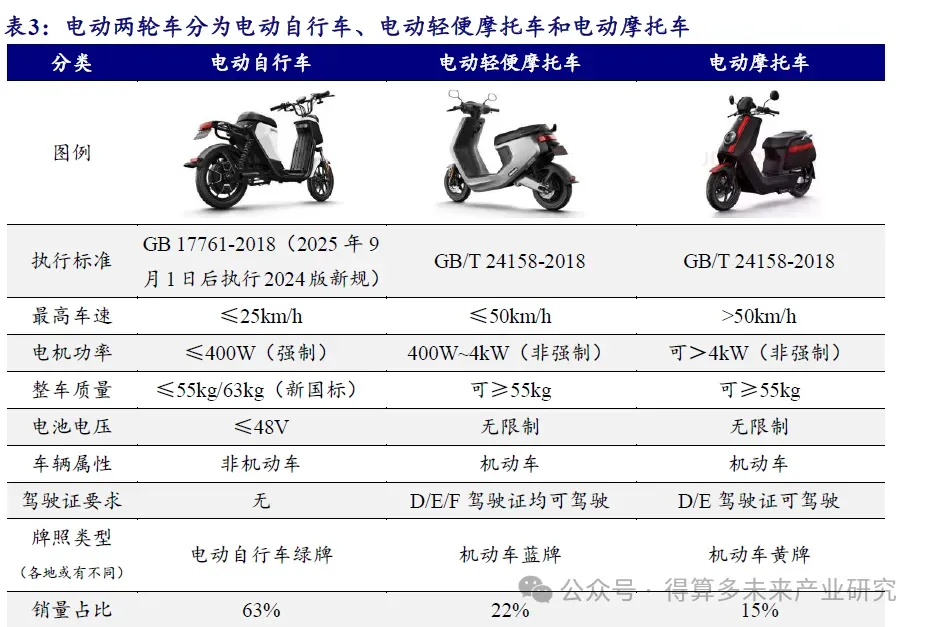电动两轮车以电动自行车为主,以蓄电池作为辅助能源。电动两轮车分为电动自行车、电动轻便摩托车、电动摩托车, 其中电动自行车为市场主流, 2024年销量占比达 63%,高于电轻摩 /电摩托的 22%和 15%。 按定义,电动自行车是 以蓄电池作为辅助能源 ,具有两个车轮,能实现人力骑行、电动或电助动功能的特种自行车。