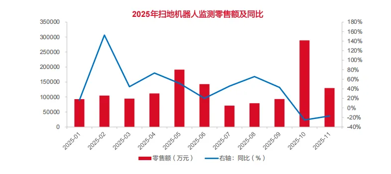 年底大促:内销基数影响逐渐显现。据奥维线上监测数据,2025年“双11”活动期间,扫地机器人销售额同比下滑2 6.4%,去年同期基数较高。若与2023年“双11”同期相比,扫地机器人线上销售额增长3 3.0%。价格方面,受促销加码、品牌竞争加剧等多重因素影响,扫地机器人线上监测均价同比下降6%至3535元。