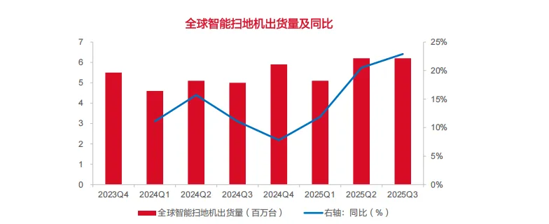 全球扫地机市场规模可观。随着产品力提升和市场教育的推进,扫地机产品逐渐得到更多消费者的认可,据IDC数据,全球智能扫地机市场2024年出货2060.3万台,同比增长11.2%;全年销额为93.1亿美金,同比增长19.7%。技术升级推动产品均价上探,2024年扫地机市场平均单价上涨7.6%至452美金。2025年前三季度,全球智能扫地机器人累计出货1742.4万台,同比增长18.7%;其中三季度出货616.1万台,同比增幅达22.9%。