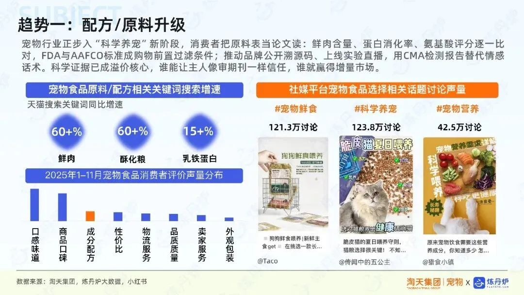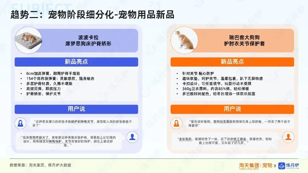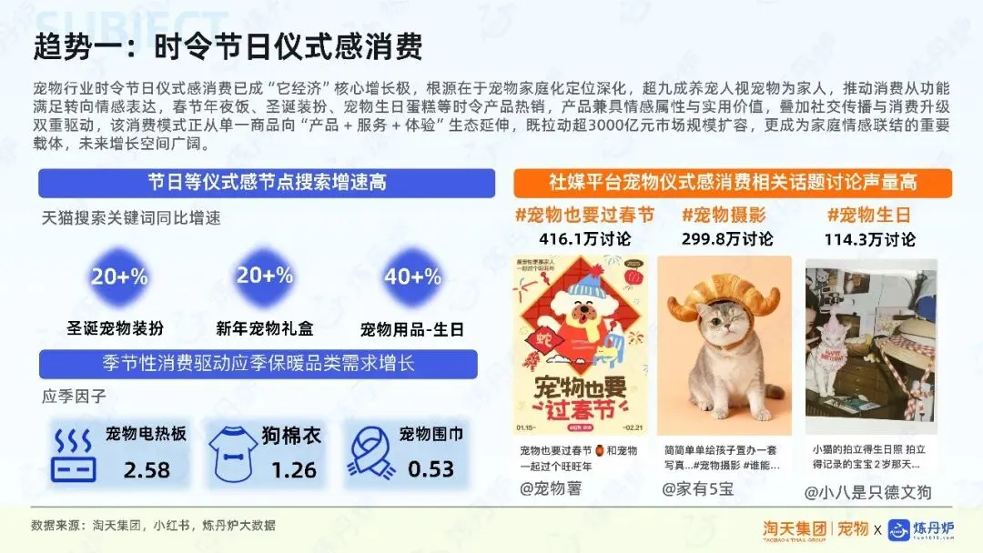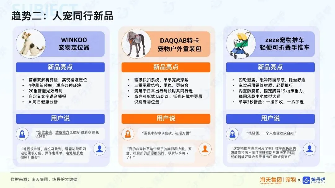 宠物行业市场规模持续扩容,成交金额逐年增长,新品数量与交易规模不断扩大,显示出强劲的市场活力。消费趋势方面,宠物被视为家庭成员,消费者更愿意为情感陪伴、时尚穿搭、科学养宠及智能化产品支付溢价。例如,宠物时尚、人宠共生、科学理性决策等成为消费新热点,推动宠物用品向多元化、精细化发展。