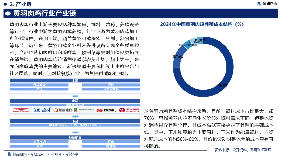 产业链核心节点:黄羽肉鸡行业上游主要包括种鸡繁育、饲料、兽药、养殖设备等行业,行业中游为黄羽肉鸡养殖,行业下游为黄羽肉鸡加工和终端销售,在加工端,涵盖黄羽肉鸡屠宰、分割、熟食加工等环节,近年来,黄羽肉鸡企业引入先进设备实现全程质量控制,产品也从初级鲜肉向冷鲜鸡、预制菜等高附加值品类拓展;在销售端,黄羽肉鸡传统销售渠道以农贸市场、超市为主,是面向家庭消费的主要途径,新兴渠道主要包括线上生鲜平台与社区团购,同时,还对接餐饮行业,为其提供适配不同烹调需求的原料。