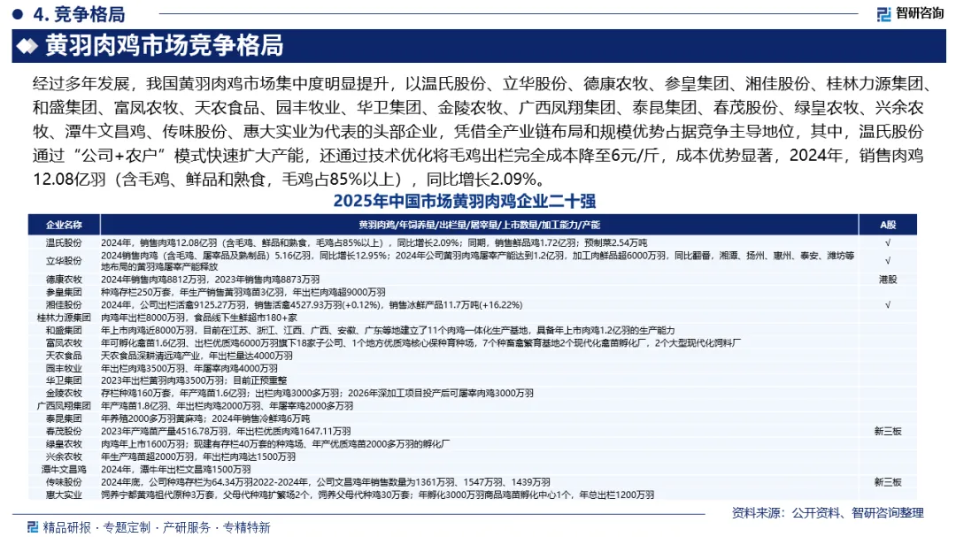 市场竞争格局:经过多年发展,我国黄羽肉鸡市场集中度明显提升,以温氏股份、立华股份、德康农牧、参皇集团、湘佳股份、桂林力源集团、和盛集团、富凤农牧、天农食品、园丰牧业、华卫集团、金陵农牧、广西凤翔集团、泰昆集团、春茂股份、绿皇农牧、兴余农牧、潭牛文昌鸡、传味股份、惠大实业为代表的头部企业,凭借全产业链布局和规模优势占据竞争主导地位。