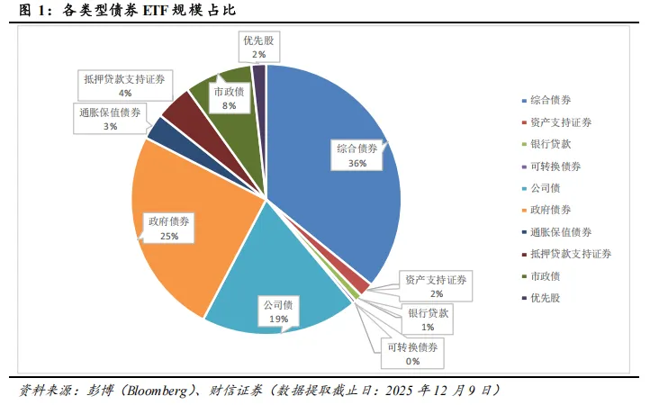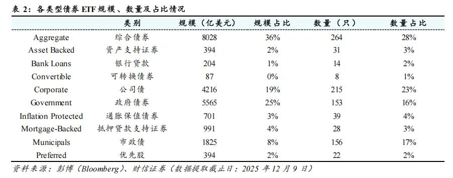 截至2025年12月初,美国全市场共930只固定收益型ETF产品,占比约20%;合计资产规模约2.24万亿美元,占比约17%。
