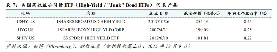 主要投资于评级BB+/Ba1及以下的非投资级债券,虽票息丰厚,但信用风险和价格波动偏高,与股市相关性较强,常被视为“类股票资产”。代表产品包括HYG、USHY和SPHY,适合风险承受能力较强、追求较高收益的投资者。