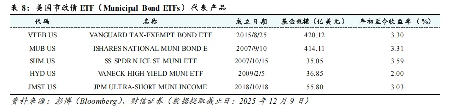代表产品如Vanguard Tax-Exempt Bond ETF(VTEB)和iShares National Muni Bond ETF(MUB)覆盖全美投资级市政债,信用质量较高、久期适中,兼具稳定收益与低违约风险;此外还有短期(如SS SPDR N ICE ST MUNI ETF)、超短期(如JPM ULTRA-SHORT MUNI INCOME)及高收益品种(如VANECK HIGH YIELD MUNI ETF),分别满足不同风险偏好和利率环境下的需求。