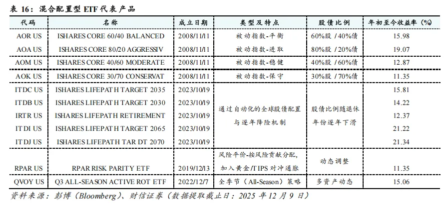 混合配置型:通过静态或动态搭配股票、债券、大宗商品及REITs等另类资产,实现一站式多资产投资。截至2025年12月初,美国全市场共147只混合配置型ETF产品,合计资产规模约397.26亿美元。