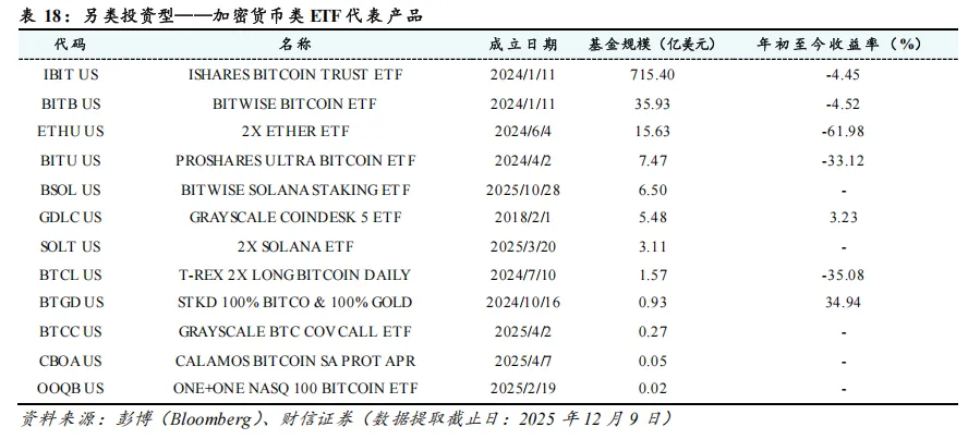 从底层投资标的来看,加密货币类产品不仅包含比特币、以太坊两大核心币种,还拓展至索拉纳、XRP、狗狗币、莱特币等非主流加密货币,形成了从主流到小众的完整币种布局;产品形态上则从基础的现货/信托型延伸至杠杆/反向、策略型、组合配置型等多元产品,满足了不同投资者的配置与交易需求。