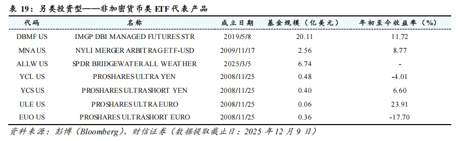 1)一类是传统另类策略产品,涵盖管理期货、并购套利、市场中性、多空股票、全球宏观等策略,代表产品有景顺管理期货 ETF、纽约人寿并购套利 ETF、道富桥水全天候策略基金,主要用于组合风险分散与对冲;