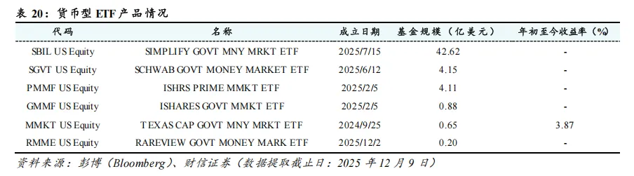 货币型:主要投资于美国国债、联邦机构短期债券等政府信用背书工具,信用风险较低。截至2025年12月初,美国全市场共有6只货币型ETF,合计资产规模约52.62亿美元。