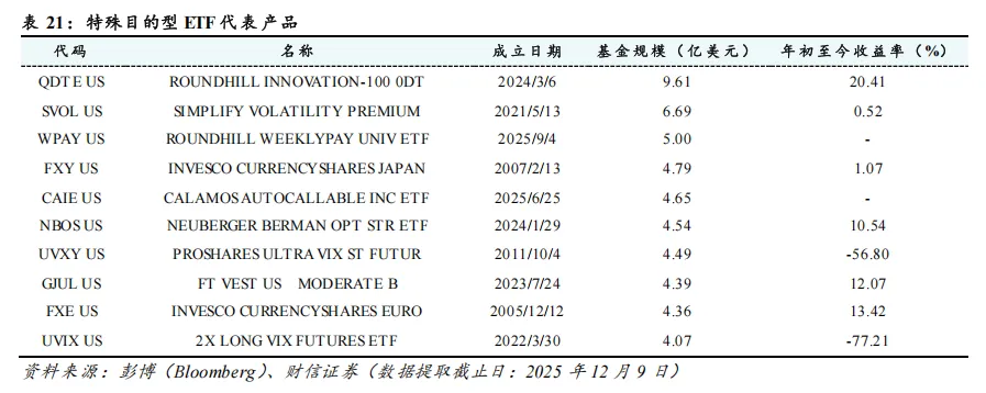 特殊目的型:覆盖波动率交易、期权套利、外汇敞口、结构化收益等多种策略,相对适合专业投资者。截至2025年12月初,美国全市场共有35只特殊目的型ETF,合计资产规模约78.62亿美元。