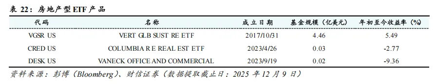 房地产型:美国全市场共有3只房地产型ETF,合计资产规模约4.51亿美元。这三只产品均投资于REITs,兼具稳定分红与抗通胀属性,收益来源于底层物业租金与资产增值。