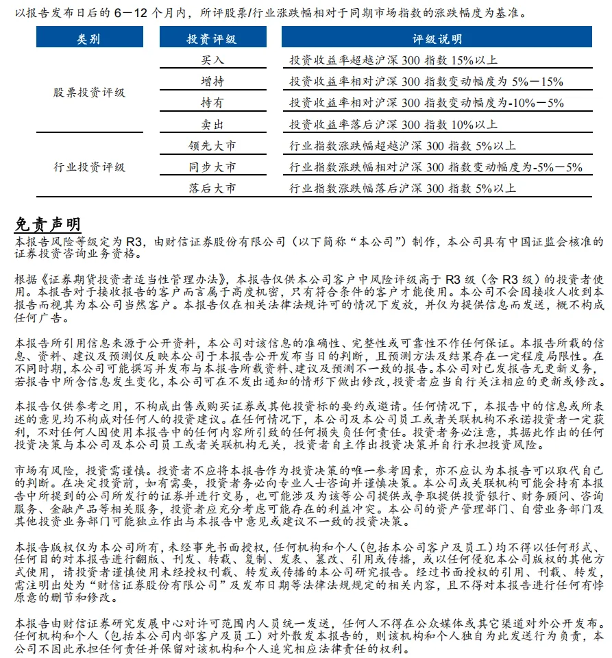 本订阅号不是财信证券研究报告的发布平台,所载内容均来自财信证券已正式发布的研究报告或对报告进行的跟踪与解读,订阅者若使用所载资料,有可能会因缺乏对完整报告的了解而对其中关键假设、评级、目标价等内容产生误解。提请订阅者参阅财信证券已发布的完整证券研究报告,仔细阅读其所附各项声明、信息披露事项及风险提示,关注相关的分析、预测能够成立的关键假设条件,关注投资评级和证券目标价格的预测时间周期,并准确理解投资评级的含义。