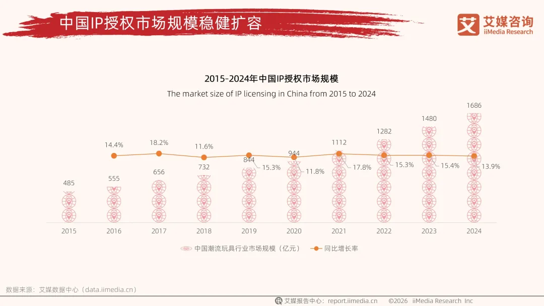 在消费端,Z世代与Kidult文化崛起,精神消费需求激增,IP成为情感连接的核心载体。在供给端,IP孵化体系成熟,头部企业构建IP全链条运营能力,推动中国IP授权市场规模稳健扩容,IP化也成为潮玩增长的核心引擎。