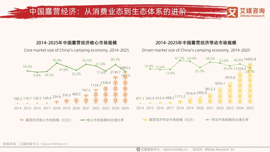 iiMedia Research(艾媒咨询)数据显示,2025年中国露营经济核心市场规模达2483.2亿元,同比增长16.1%;带动市场14402.8亿元,同比增长24.7%。露营经济进入“核心扩容+全域带动”的成熟发展阶段。核心市场的增长是基础动力,带动市场的爆发则体现了露营经济对关联产业的辐射能力,二者共同推动露营从单一消费业态升级为复合型经济生态。