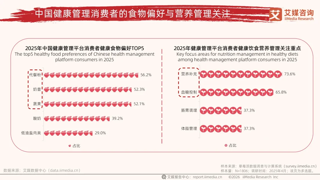 iiMedia Research(艾媒咨询)数据显示,2025年中国健康管理平台消费者最偏好的健康食物为代餐粉(56.2%)、奶昔(52.3%)、蔬果(52.1%)。对于营养管理的关注重点是“营养补充”(73.6%)和血糖控制(65.8%)。
