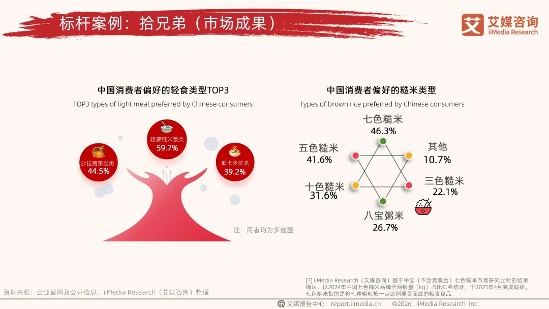 随着“健康饮食”的概念教育日益深化,消费者逐渐将目光转向主食革新。数据显示,粗粮糙米饭类是最受消费者青睐的轻食类型,其中,以七色糙米为代表的科学复配产品,正以其复合营养价值成为该品类的增长曲线。在此趋势下,拾兄弟品精准锚定该核心品类,通过强化供应链与品控,并依托高效的营销网络,实现品牌声量与市场份额的协同增长,最终于2024年斩获“七色糙米全网销量第一”的销售成绩。