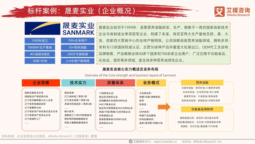 晟麦实业在原料、工艺、质量三大维度构建层层递进的竞争优势,支撑其产品覆盖40+国家、服务700+企业客户,领跑高端营养油脂全球市场。原料端,通过全球黄金产区直采(波兰黑加仑籽、肯尼亚牛油果等)结合国内10万余亩有机种植基地的全产业链布局,搭配十道净化筛查,从源头保障原料品质与供应稳定。在此基础上,以物理原生冷榨、微米级过滤、食品级氮气锁鲜三大核心技术,保留热敏性营养素,提升油烟点延缓氧化,实现营养与新鲜双重突破。为夯实品质壁垒,其手握美国膳食补充剂GMP、全球四大有机等15项国际认证,参与亚麻籽油国标制定,配备200+项检测能力的理化实验室,强化品牌公信力,最终构筑起全链路核心竞争力。