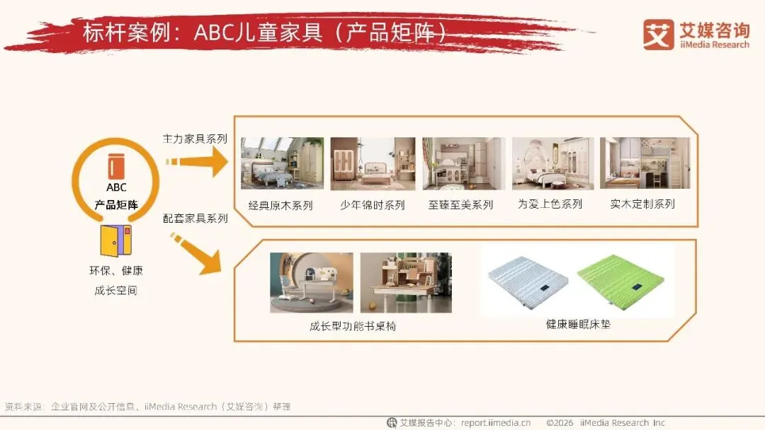 ABC儿童家具基于对儿童成长需求的全面洞察,构建了覆盖不同审美与功能需求的五大主力家具系列,包括:强调天然质感与纯粹体验的原木系列、融合时尚元素与多元生活方式的锦时系列与上色系列、追求美学设计与功能平衡的至美系列,以及提供灵活空间解决方案的个性化定制服务。在此基础上,ABC儿童家具进一步配套儿童成长系列书桌椅与健康睡眠床垫,形成从家具到配套、从成品到定制的完整体系,实现对儿童成长全周期、全风格审美需求的系统覆盖。